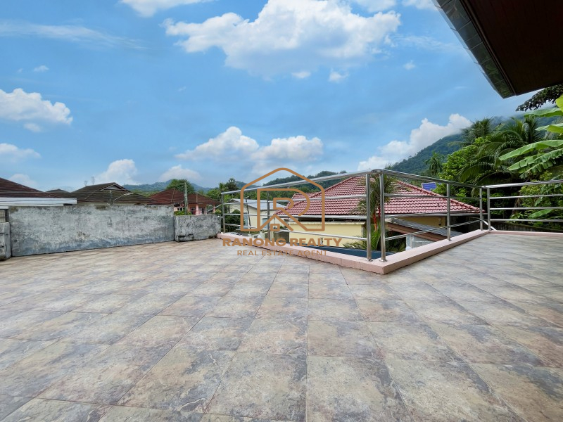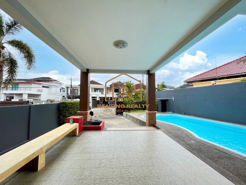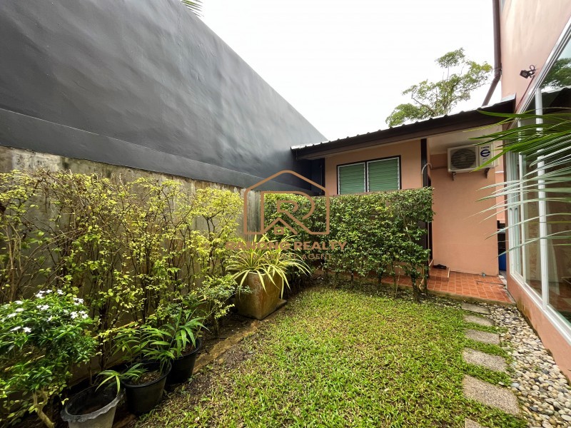 Sunny & Bright 3-bedroom house for rent in Kathu, Phuket. The house is conveniently located between Patong Beach and town. Convenience stores and a Fresh Market are nearby. Good neighborhood. A two-storey house has a spacious living and dining area. Western kitchen, including refrigerator, microwave, and kitchen ware. There is one bathroom and a storage room beneath the stairs. On the second floor, there are 3 bedrooms, consisting of one master bedroom with a master bathroom that includes a large bathtub. One standard room and another bedroom with a large terrace. The maid's room with en suite bathroom connect to the house. Fountain flows are cool and soothing. Choline swimming pool. A large patio can be transformed into a picnic and grilling area. One car is parked inside the house, and another is parked outside.