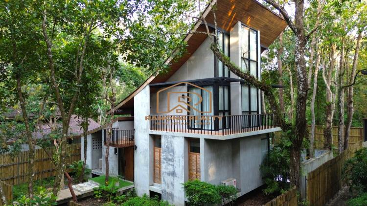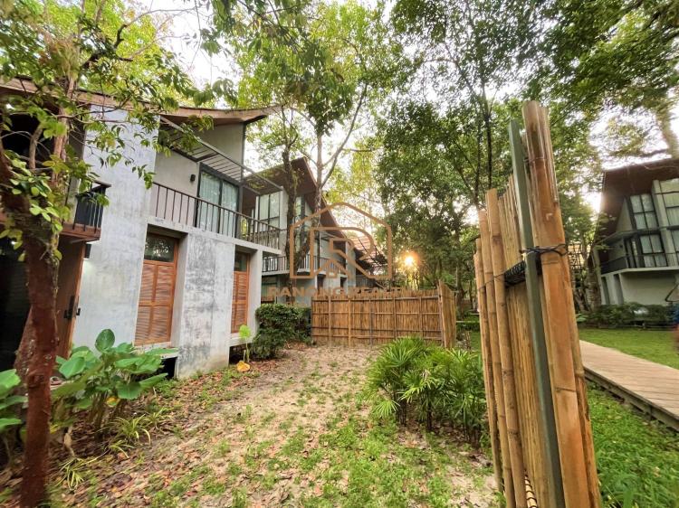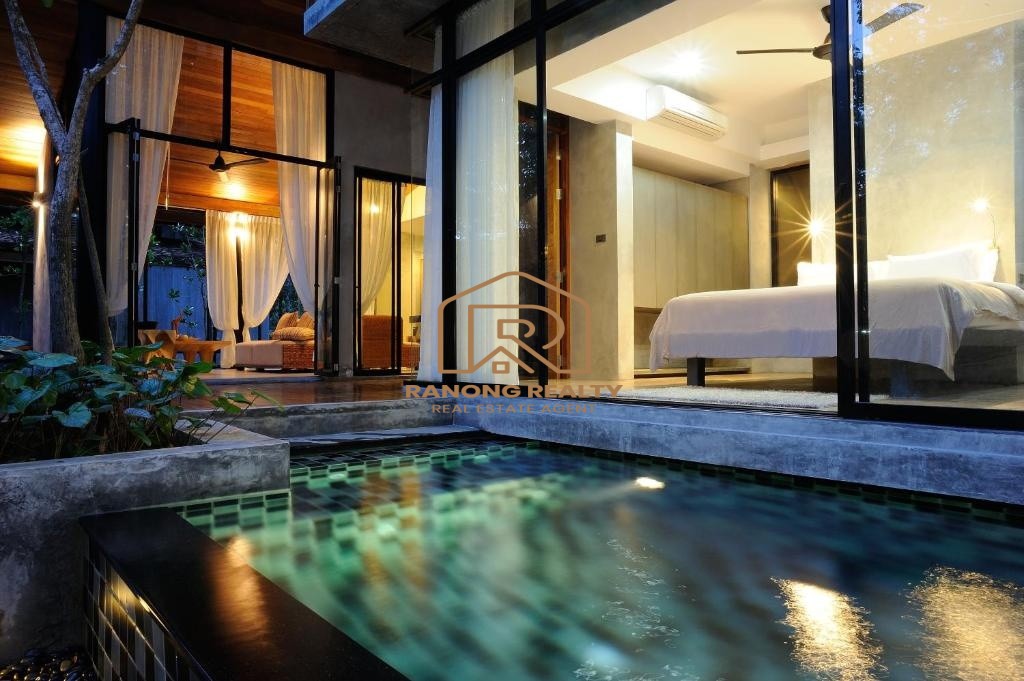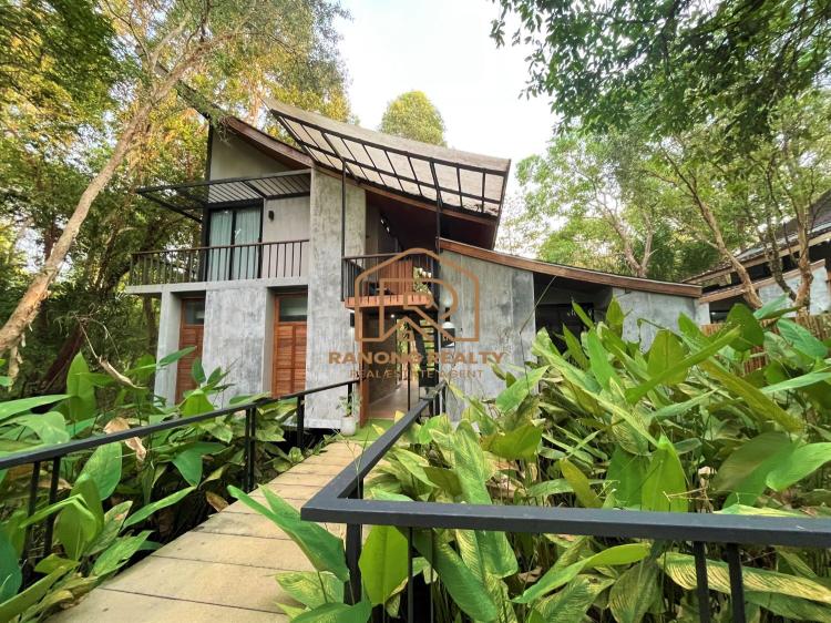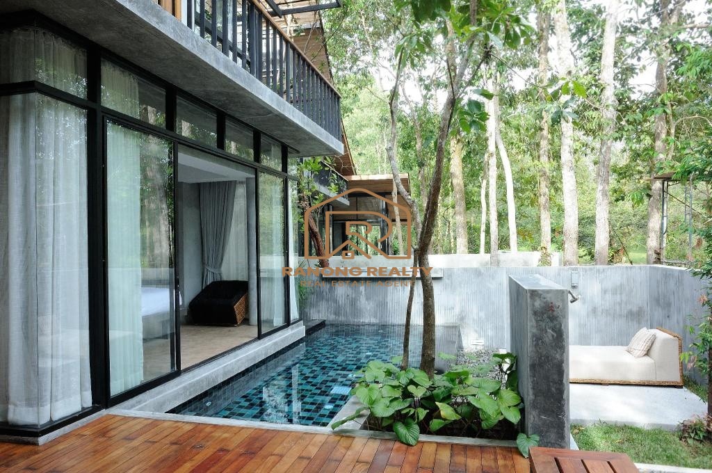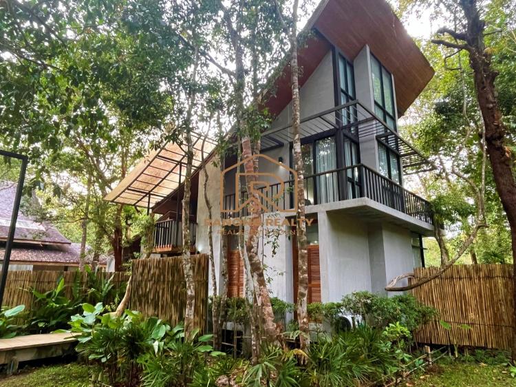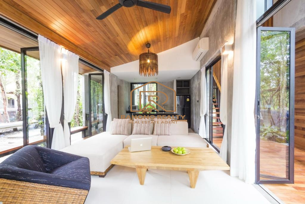 How wonderful it is to live in the forest in the amazing climate of Krabi! The unique, elegant villa is in the lush tropical gardens and nearby the beach, only 200 meters away. Private and quiet area. Each duplex 8-villa unit features a fully furnished two-bedroom with an en suite bathroom, a spacious lounge area, and an outdoor dining area. The villa's fully sliding glass walls allow you to turn your home into an outdoor terrace in minutes. The fully furnished villa is situated on 5,314.4 square meters and features a private swimming pool measuring 2.5 x 6 meters, as well as sunbathing areas for each. There is a terrace in front of the room for relaxing. The amazing project for sale has 8 villas with a usage area of 195 sq. m. each.